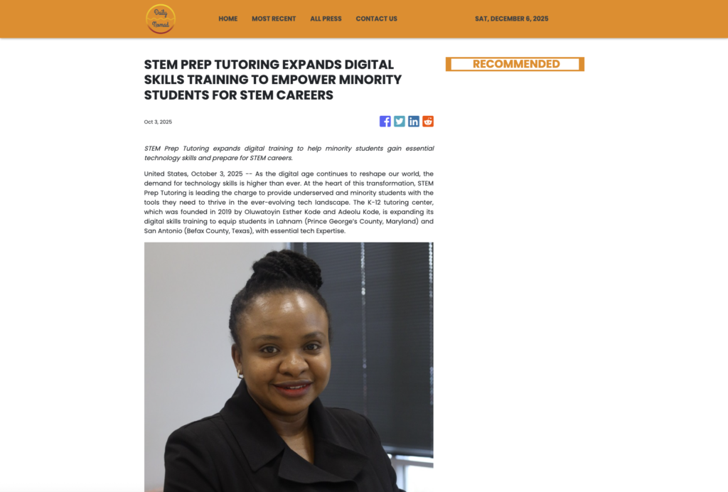 United States, October 3, 2025 — As the digital age continues to reshape our world, the demand for technology skills is higher than ever. At the heart of this transformation, STEM Prep Tutoring is leading the charge to provide underserved and minority students with the tools they need to thrive in the ever-evolving tech landscape. The K-12 tutoring center, which was founded in 2019 by Oluwatoyin Esther Kode and Adeolu Kode, is expanding its digital skills training to equip students in Lahnam (Prince George’s County, Maryland) and San Antonio (Befax County, Texas), with essential tech Expertise.