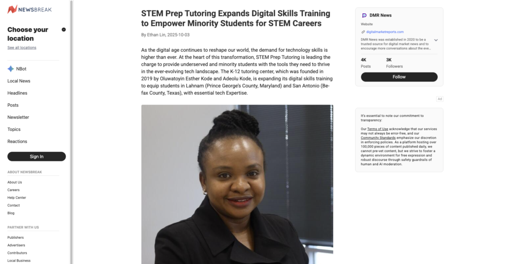 As the digital age continues to reshape our world, the demand for technology skills is higher than ever. At the heart of this transformation, STEM Prep Tutoring is leading the charge to provide underserved and minority students with the tools they need to thrive in the ever-evolving tech landscape. The K-12 tutoring center, which was founded in 2019 by Oluwatoyin Esther Kode and Adeolu Kode, is expanding its digital skills training to equip students in Lahnam (Prince George’s County, Maryland) and San Antonio (Befax County, Texas), with essential tech Expertise.