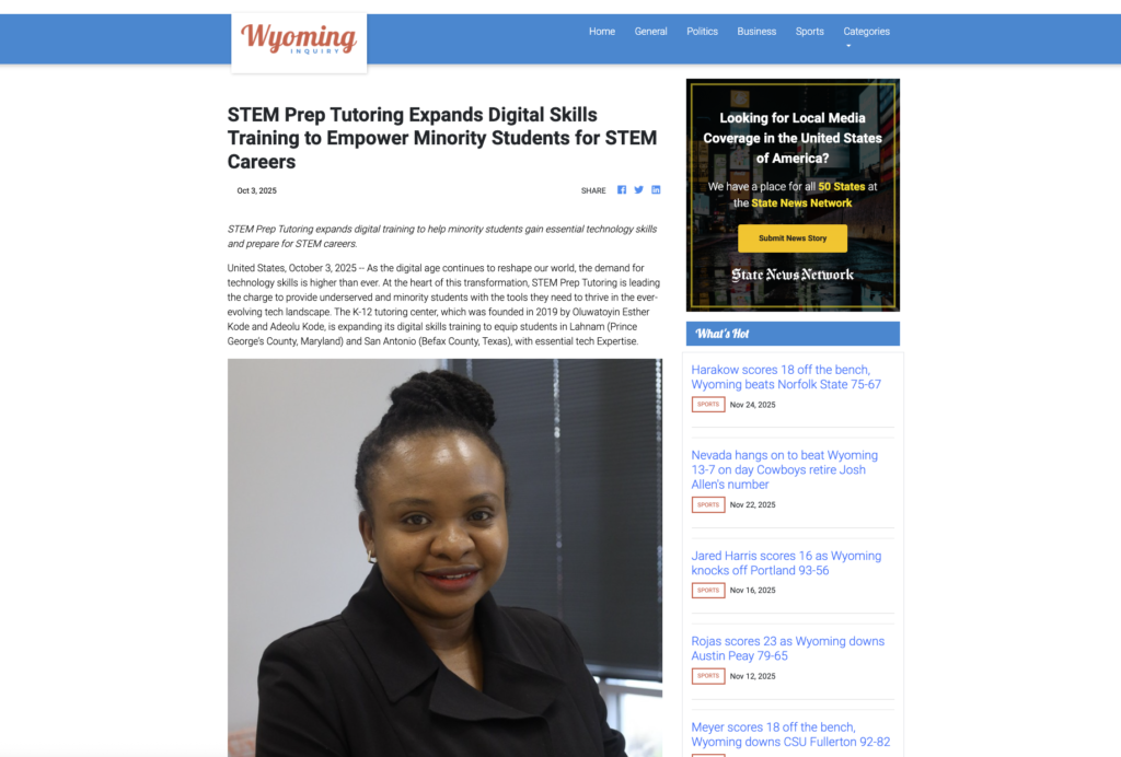 United States, October 3, 2025 — As the digital age continues to reshape our world, the demand for technology skills is higher than ever. At the heart of this transformation, STEM Prep Tutoring is leading the charge to provide underserved and minority students with the tools they need to thrive in the ever-evolving tech landscape. The K-12 tutoring center, which was founded in 2019 by Oluwatoyin Esther Kode and Adeolu Kode, is expanding its digital skills training to equip students in Lahnam (Prince George’s County, Maryland) and San Antonio (Befax County, Texas), with essential tech Expertise.